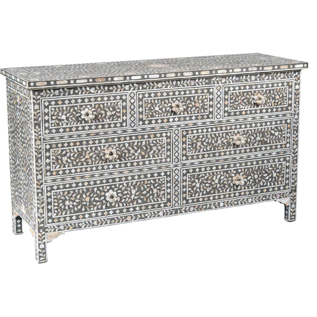 تُعد خزانة الأدراج من Iris شهادة على فن تطعيم عرق اللؤلؤ، وتتميز بنمط زهوري دقيق ينضح بجماليات هادئة ومصقولة. يتم تصنيع كل تطعيم يدويًا بخبرة من قبل حرفيين مهرة، مما يضمن أن تكون كل قطعة فريدة من نوعها. توفر درجات اللون الرمادي الدقيقة لتطعيم عرق اللؤلؤ لمسة معاصرة على تقنية كلاسيكية، مما يجعل هذه الخزانة قطعة متعددة الاستخدامات تكمل مجموعة واسعة من الديكورات الداخلية.