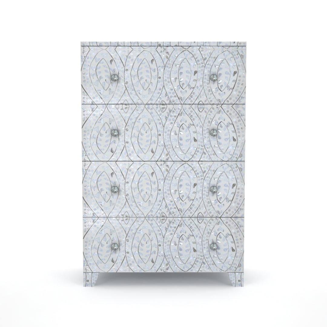 تتميز خزانة الأيريس بأربعة أدراج تعمل بسلاسة، وكل منها مزين بشكل جميل بتطعيمات من عرق اللؤلؤ الأبيض. يتم تصنيع الأنماط الدقيقة والمعقدة يدويًا بواسطة حرفيين مهرة، مما يجعل كل خزانة تحفة فنية فريدة من نوعها. يخلق اللمعان اللامع لعرق اللؤلؤ على خلفية بيضاء نقية جمالية فاخرة وهادئة، مناسبة لمجموعة متنوعة من أنماط الديكور الداخلي.