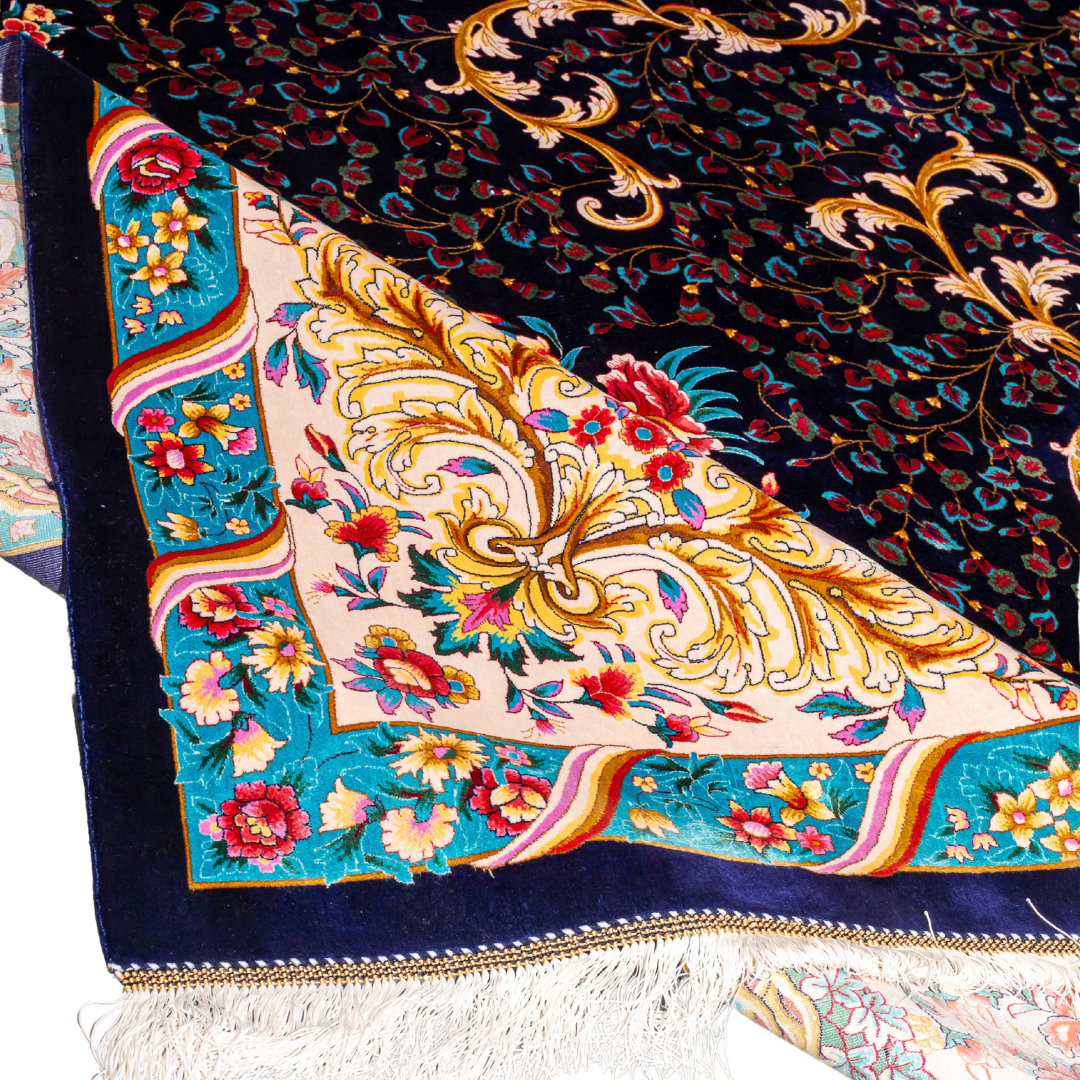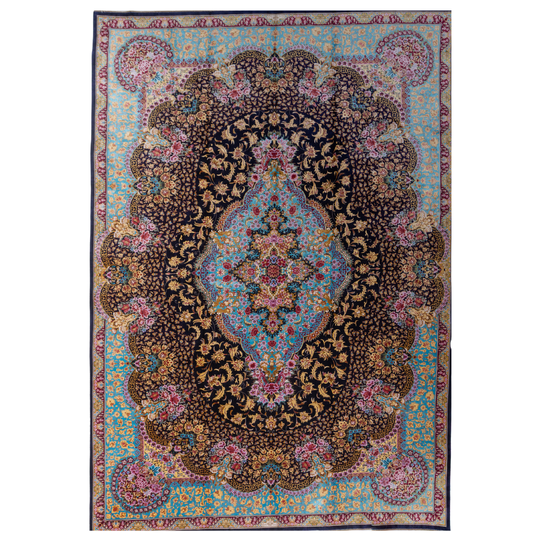 Elegant navy silk rug with detailed floral medallion, ornate cream border, and rich Persian-inspired design in gold, coral, and turquoise tones.Elegant navy silk rug with detailed floral medallion, ornate cream border, and rich Persian-inspired design in gold, coral, and turquoise tones.