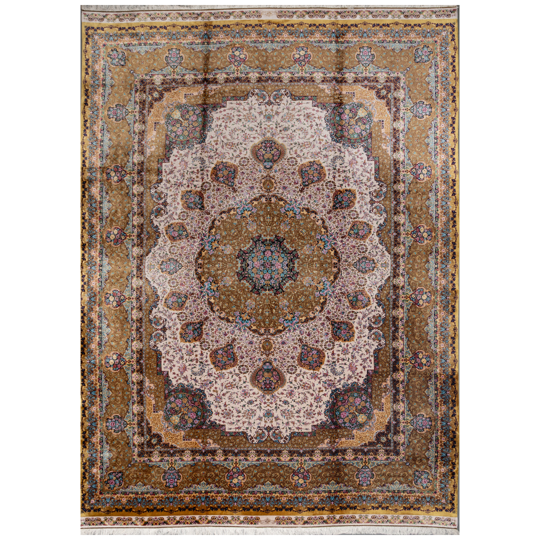 Silk Persian rug with an ivory base, colorful hunting scene, and a detailed border in plum, gold, teal, and indigo floral patterns.Silk Persian rug with an ivory base, colorful hunting scene, and a detailed border in plum, gold, teal, and indigo floral patterns.