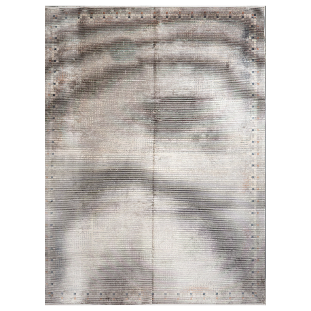 Kaelis Cotton rug in 400x300 cm featuring muted tones of grey, ivory, blue, and burnt orange in a softly distressed modern texture.Kaelis Cotton rug in 400x300 cm featuring muted tones of grey, ivory, blue, and burnt orange in a softly distressed modern texture.