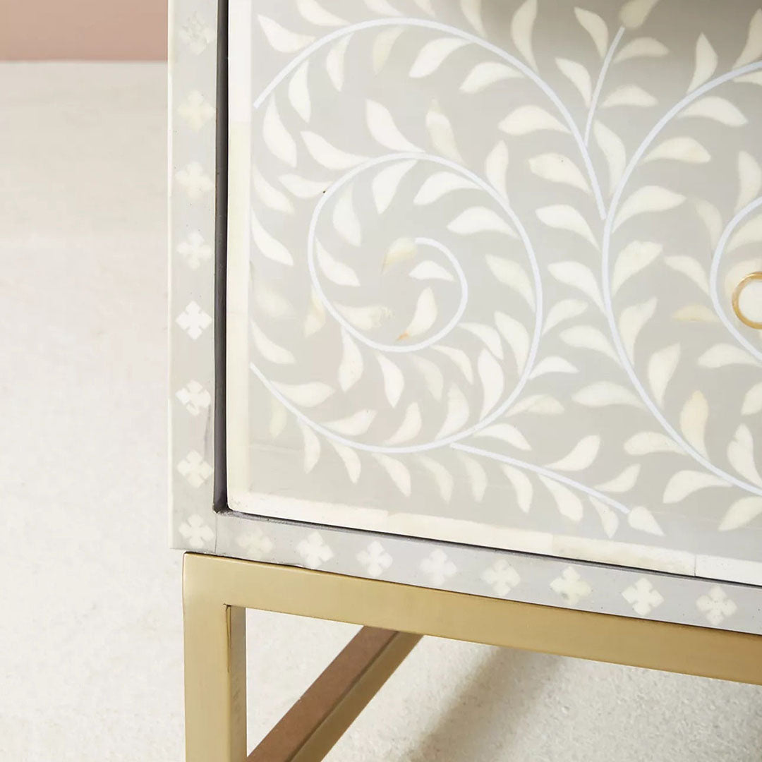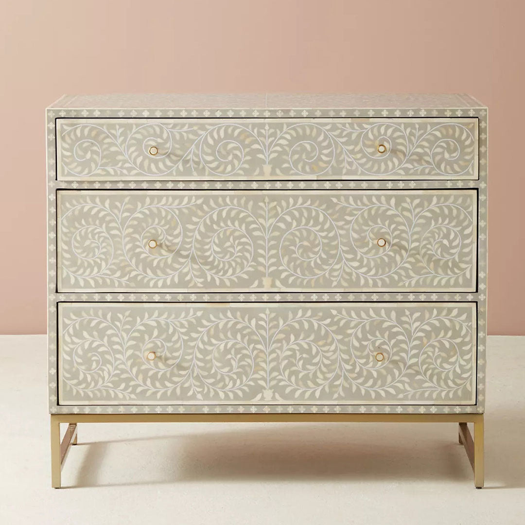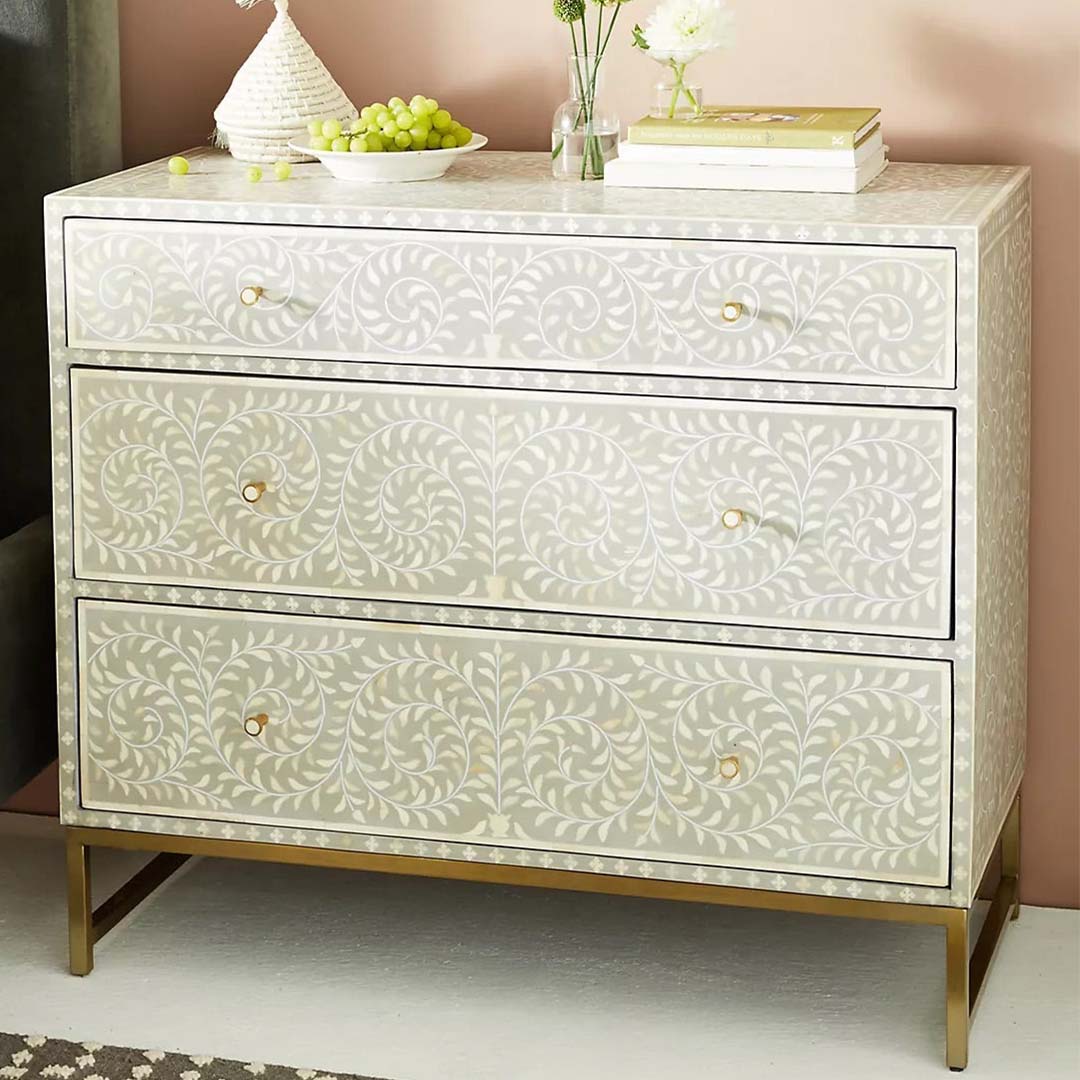 The Seema Bone Inlay Chest of Drawers is a stunning and functional piece that seamlessly blends artistry and practicality. Handcrafted with meticulous attention to detail, this chest of drawers features intricate bone inlay patterns that create a visually captivating display. The contrasting colors and textures of the inlay against the solid wood construction bring a sense of elegance and exotic charm to any room. With multiple drawers, it offers ample storage space for organizing your belongings in a stylish manner. The smooth gliding mechanism ensures easy access to your items. Whether used in the bedroom, living room, or hallway, the Seema Bone Inlay Chest of Drawers adds a unique and artistic element to your home decor, enhancing the aesthetic appeal of your interior while providing practicality and storage solutions.