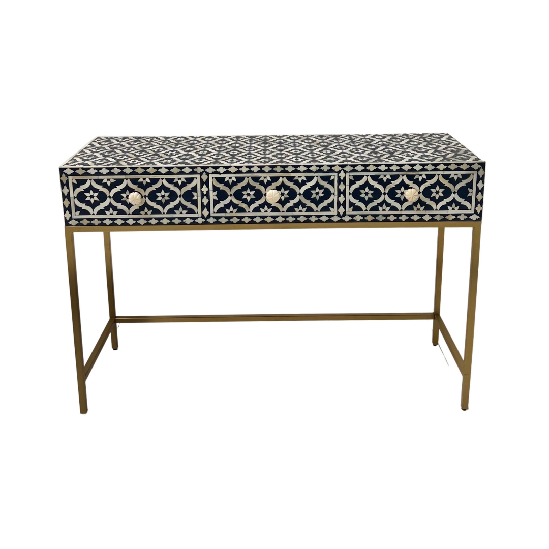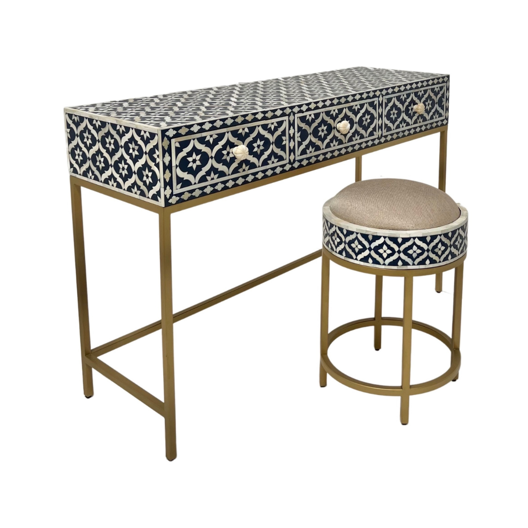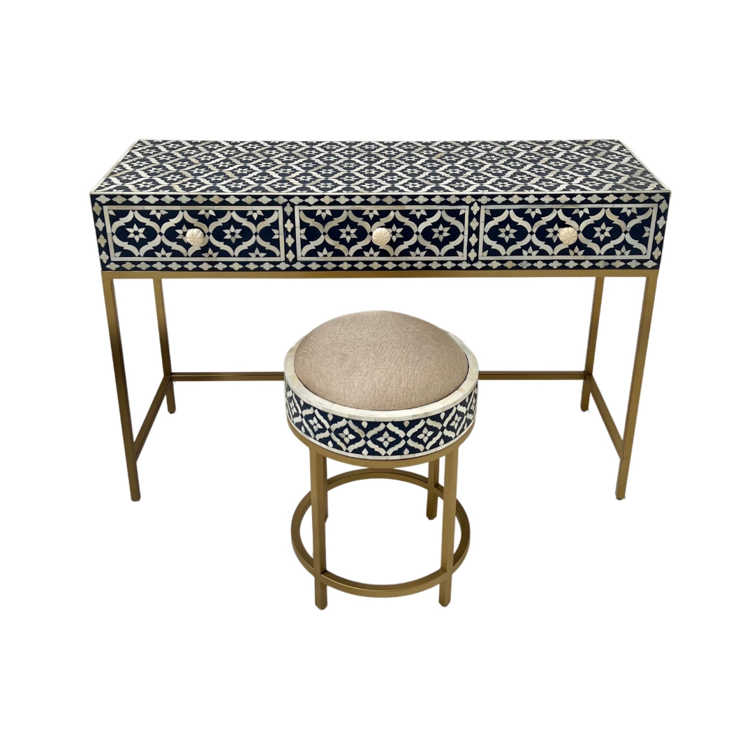 Immerse yourself in the mesmerizing beauty of the Inayat Bone Inlay Console with Stool, a stunning combination that brings elegance and functionality to your living space. Meticulously crafted, this exquisite set showcases intricate bone inlay designs, created by skilled artisans. The console features a captivating visual display with mesmerizing patterns and textures, adding a touch of sophistication to any room. Its ample surface area provides space for decor, while the drawers offer convenient storage for your essentials. The matching stool complements the console perfectly, serving as extra seating or a stylish footrest. Whether placed in your hallway, living room, or bedroom, the Inayat Bone Inlay Console with Stool effortlessly combines practicality with artistic allure, making it a remarkable addition to your home decor. Let this extraordinary set elevate your living space with its exquisite craftsmanship and striking presence.